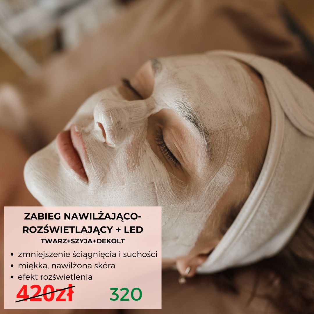 ZABIEG WYGŁADZAJĄCO-NAWILŻAJĄCY + NAŚWIETLANIE LED (twarz+szyja+dekolt) 420ZŁ 320zł